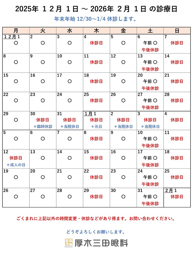 診療日程のご案内(2025年12月1日~2026年2月1日)