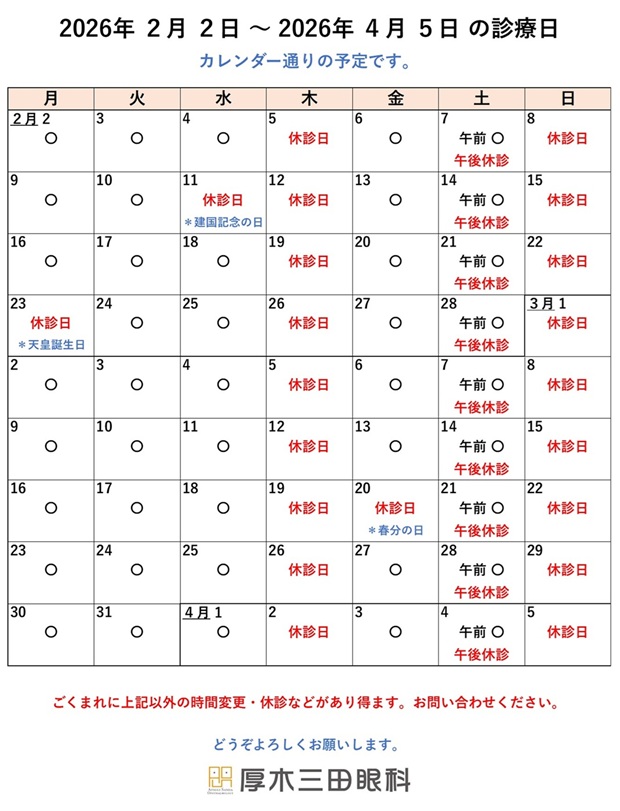 診療日程のご案内(2026年2月2日~2026年4月5日)